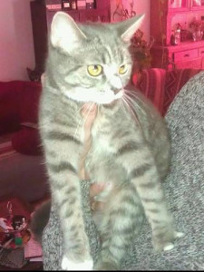 Im Moment habe ich nur das eine Bild von ihm, bevor wir ihn einfangen konnten, der hübsche Graue, mit den weißen Pfoten, das ist er...