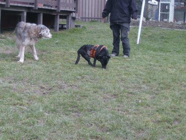 So kann er im Hof das Laufen üben, ohne sich wund zu scheuern, denn da läuft er lieber als im Garten.